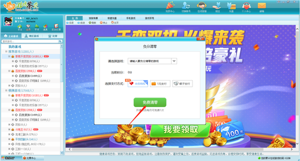 3、在负分清零界面中,我们需要先选择自己清分的游戏,选择后,系统会反显我们该游戏目前的分数,然后需要我们选择支付负分清零的方式(会员特权、1元清分、银子支付),最后,点【清零】即可。
