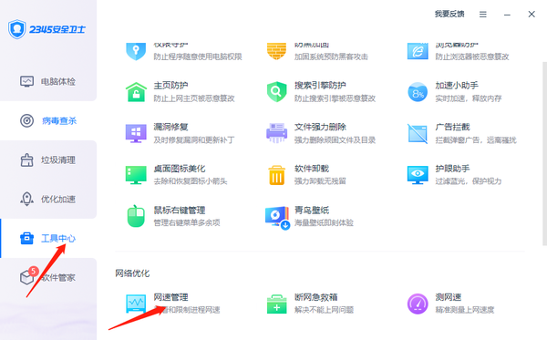 1、首先启动电脑端2345安全卫士软件,然后点击界面左侧的【工具中心】功能。进入到软件的工具中心界面当中后,我们找到【网速管理】功能,并点击它。