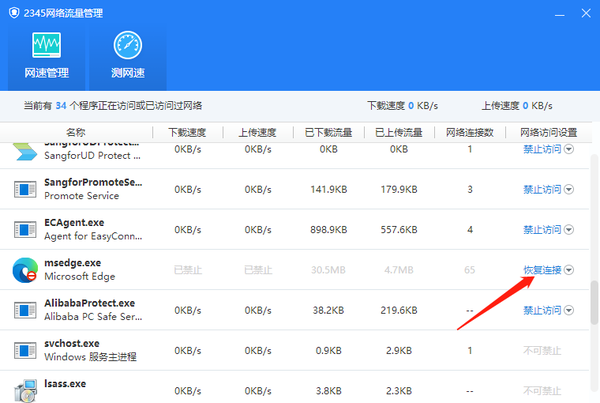 4、而想要恢复edge浏览器的网络访问权限的话,我们只需要在2345网络流量管理界面,点击msedge右侧的【恢复连接】,当这个恢复连接变成禁止访问,就说明恢复网络连接设置成功了。