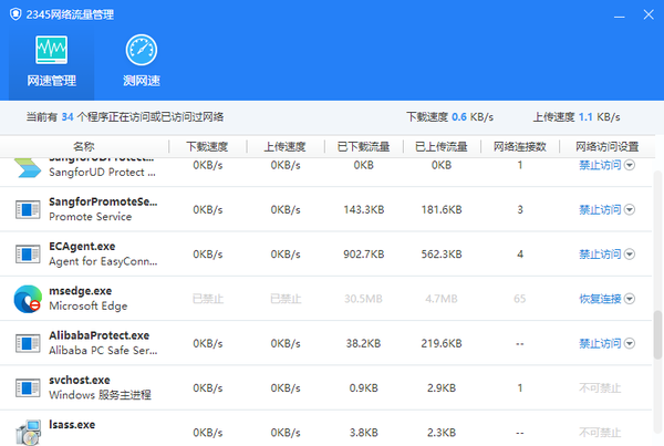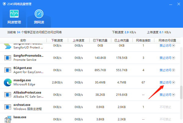 2、接着软件就会弹出2345网络流量的管理窗口了,在该界面就可以看到正在访问或已访问过网络的软件了找到想要禁止联网的软件,比如【msedge】,然后点击其右侧的【禁止访问】功能。