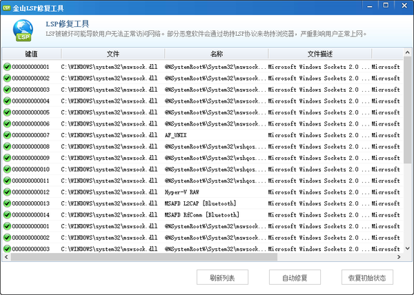 金山毒霸搭建智能资源调度中心,快速启动、运行更快,自研蓝芯V本地引擎,结合云引擎,毫秒响应,智能查杀,同时也可以检测网络运行速度,解决您在电脑使用过程中下载软件慢、网卡异常,网络不稳定等问题。打开金山毒霸,在下方选择【百宝箱】进入,然后找到【LSP修复工具】即可。