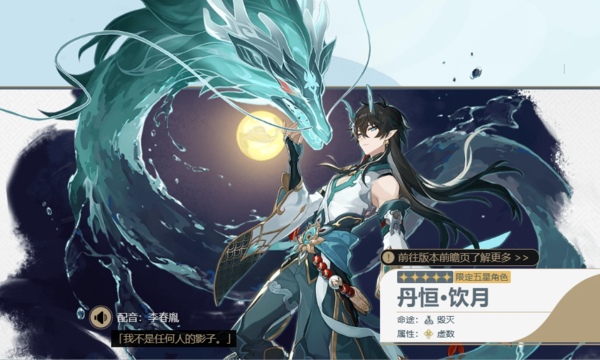 上半程:限定5星角色——丹恒·饮月,虚数属性的毁灭命途角色,拥有极强输出能力,通常在队伍中担任“主C”位置;