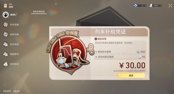 接下来是小月卡——列车补给凭证,价格为30元。其主要形式为:购买后可以立即获得300古老梦华,然后在接下来的30日内,每天可以获得90星琼。当然,小月卡并不会像大月卡一样,会受到版本的影响,即使是跨版本,也是生效的,它的有效期仅和时间有关。