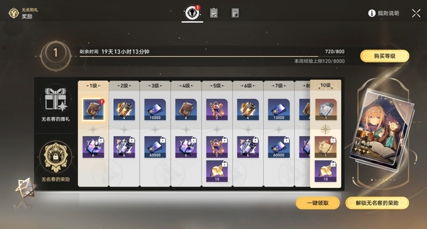 还是先说大月卡——无名客的勋礼,其价格为68元(当然也可以选择128元的升级版大月卡)。我们在游玩游戏时,需要通过完成每日的活跃度任务,从而获得无名勋礼的经验值,从而提升大月卡等级,以解锁更多奖励,其中大月卡每10级都会有超好的奖励,有车票、命运的足迹,甚至到了30级,还可以获得4星大月卡光锥,其效果更加强力;如果大月卡等级达到50,还可以获得680星琼奖励,真的是物超所值!