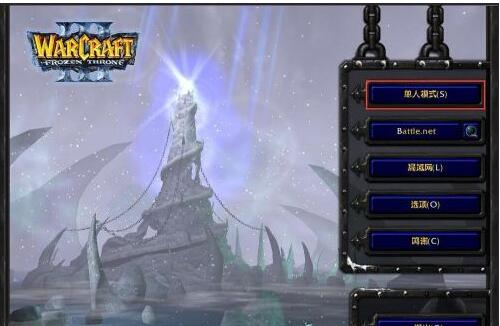 第一步,小编用人机对战为大家举例子,我们在电脑上下载好《魔兽争霸3》以后,启动进入到游戏界面,先点击菜单上的第一个“单人模式”。如果想要下载正版完整的魔兽争霸3冰封王座,可以直接在财神爷站网进行下载。