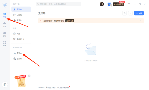 1、启动电脑端的软件,然后在默认的【下载】选项界面右侧,找到【私人空间】功能,点击它下方的【下载中】选项。