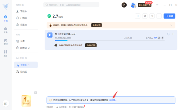 1、在迅雷的私人空间中,添加文件的下载地址进行下载,然后在界面的底部,会弹出【您还未设置密码,为了保护您的文件安全,建议您尽快设置密码】的文字,点击这段文字右侧的【去设置】蓝色文字。