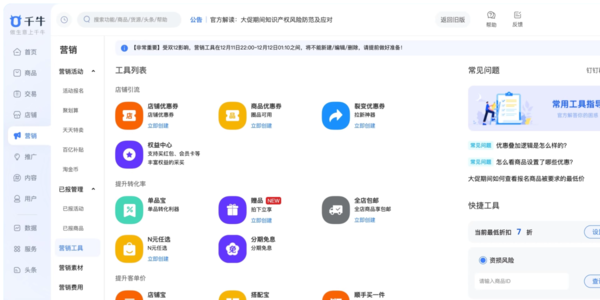 千牛是一款由阿里巴巴集团官方推出的卖家工作台,是淘宝卖家、天猫商家等必备的工具。它集合了店铺管理、商品管理、交易管理、客户管理等多项功能,旨在帮助商家更高效地进行电子商务活动。该软件界面简洁明了,操作简单易用,作为商家可以进行实时数据监控、客户评价等操作;此外,千牛支持多种插件、模板,以至于商家可以将千牛进行个性化,从而让软件用起来更加顺手。所以,千牛作为电商平台,对于进军电商的人来讲,是不可或缺的!