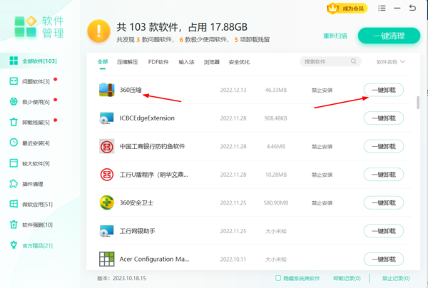 2、然后在【全部软件】界面右侧,找到要解除安装的软件,最后直接点击软件右侧的【一键卸载】按钮,最后按照提示进行卸载即可。