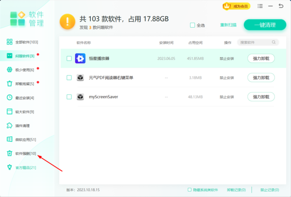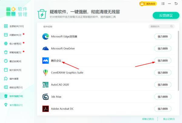 1、按照上述的方法,进入到软件的【软件管理】界面当中,然后点击左侧列表中的【软件强删】选项,点击它。