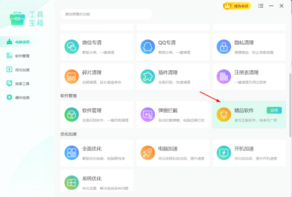 2、然后,在右侧的界面中,找到【精品软件】选项,点击它。