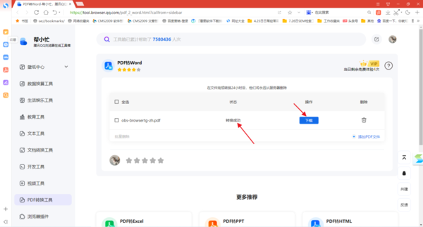 PDF文件上传并转换成功后,在界面中的【状态】就会显示为【成功】同时【操作】选项下的按钮将变成【下载】,点击【下载】按钮。