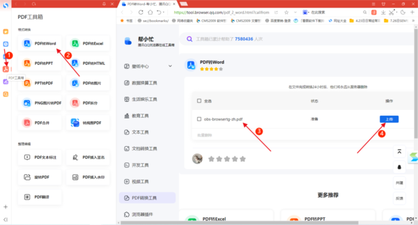 根据小编的亲自使用经验来看,可以在线免费转换PDF文件格式的浏览器是搜狗浏览器,在搜狗浏览器左侧的侧边栏中,找到第四个【PDF工具箱】,点击它,紧接着选择要转换的格式,比如【PDF转Word】,进入到PDF转Word界面当中后,添加相关文件,然后点击【上传】按钮。