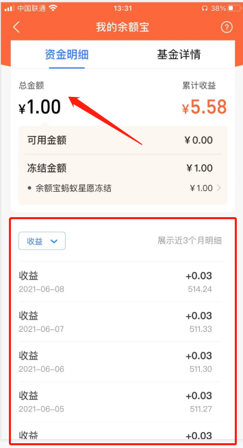 第二步:进入余额宝之后,点击冻结的金额。