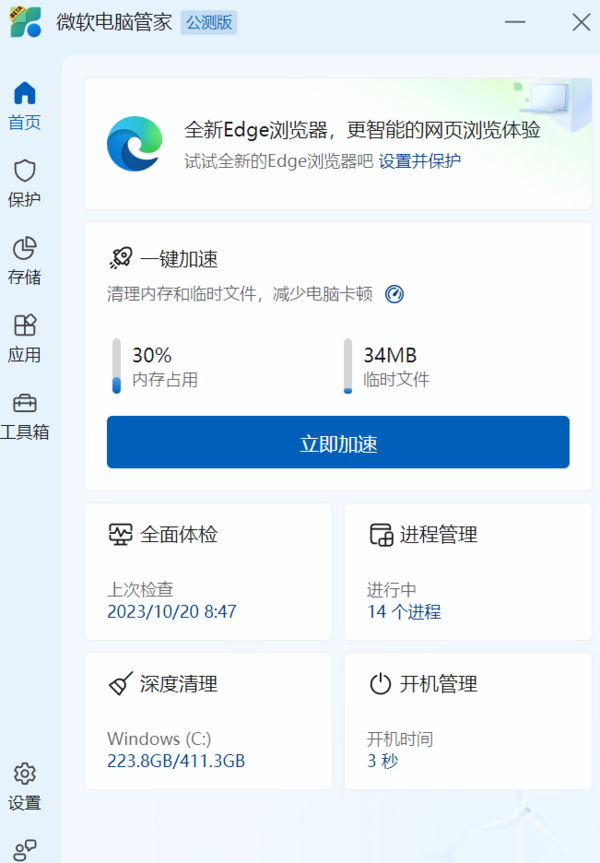 微软电脑管家相比于其他电脑清理软件功能较少,更多的是针对电脑本身的清洁以及管理,但这也让其占用电脑的内存变少。