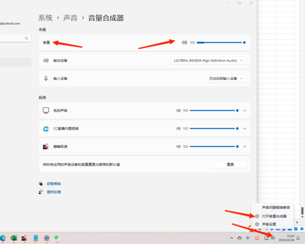 一、点击电脑系统右下角任务栏中的声音功能,点击【打开声音音量合成器】功能,最后调节音量,一般就可以解决问题。