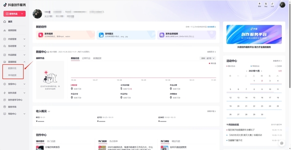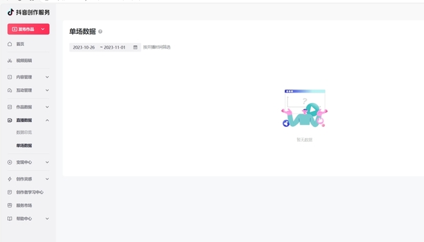 2.进入创作服务平台后,我们会看到左边的功能栏中有一个名为直播数据的选项。点击直播数据,我们可以看到两个功能:数据总览和单场数据。
