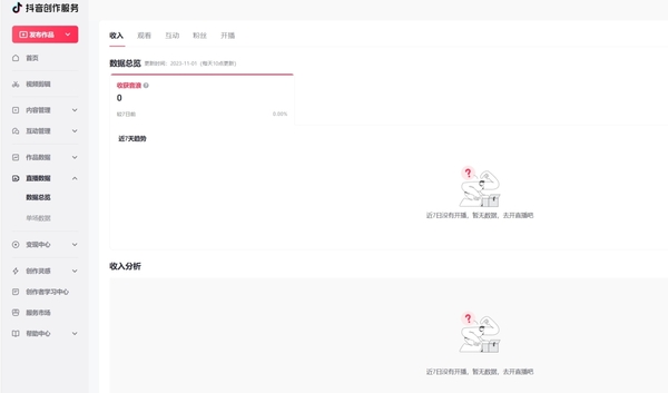 3.如果我们点击数据总览,我们将能够看到关于直播的一些重要数据。这些数据包括直播的总收入、观看人数、互动次数、粉丝数量以及开播数据。通过这些数据,我们可以了解到直播的整体表现和受欢迎程度。