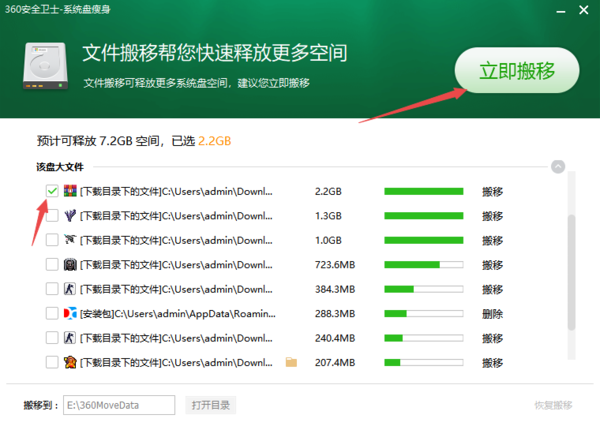 第五步,然后,勾选需要搬移的C盘文件夹,点击界面右上角的【立即搬移】按钮。