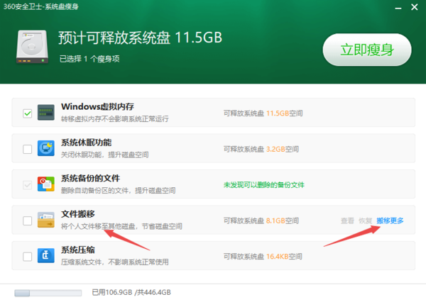 第四步,扫描完成后,点击【文件搬移】选项右侧的【搬移更多】。