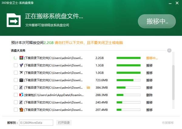 第六步,最后,软件就会开始进行文件夹的搬移了,搬移的过程中,切勿关闭360安全卫士或者是电脑,等待软件搬移完成即可。