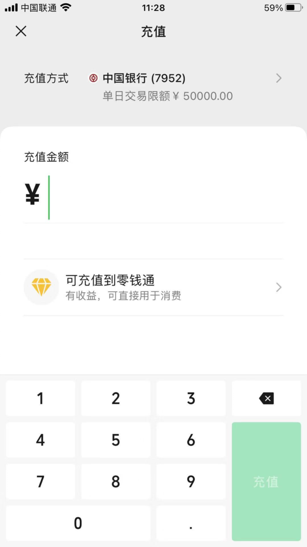 第二步:钱已经到银行卡里了,现在需要做的就是把银行卡里的资金再转移到微信钱包当中。