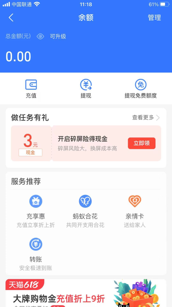 第一步:将支付宝和微信都绑定上同一张银行卡,接下来要做的就是把资金从支付宝平台转入到绑定的银行卡当中,首先进入支付宝,点击财富选项,进入财富界面,点击余额选项。