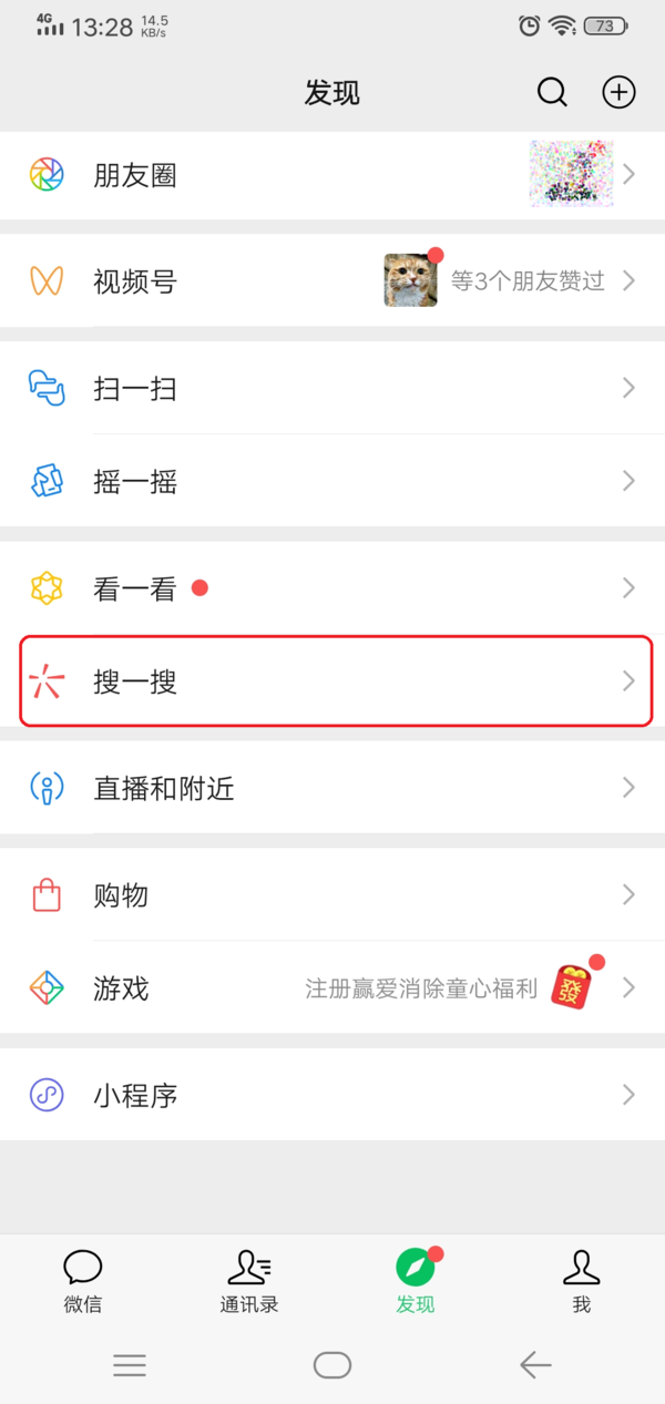 第二步,进入到微信的发现界面后,在界面中找到【搜一搜】功能,并点击打开。