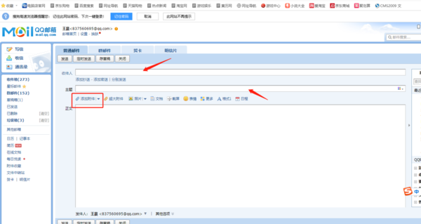5.?进入写信界面,填写收件人邮箱地址,填写主题后,点击添加附件。