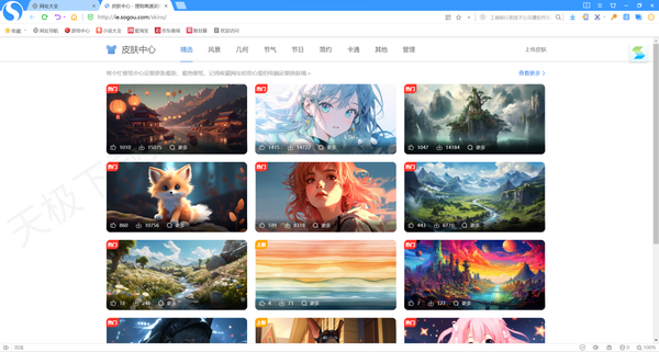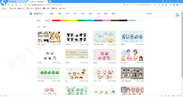 在皮肤中心,我们还可以在后方看到简约和卡通主题,在这里我们可以更换浏览器皮肤;还可以上传皮肤获得积分,赢取精美礼品。