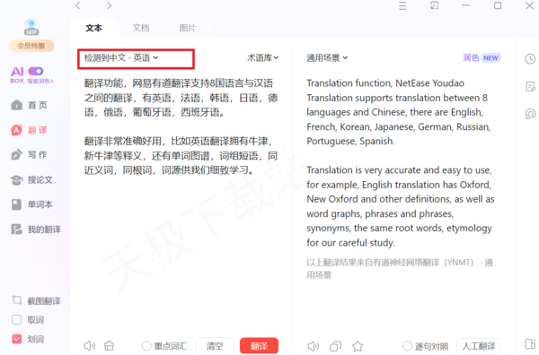 2.文本翻译,将需要翻译的文本粘贴进来即可自动翻译,这个功能支持的语种更多,还可以选择使用场景进行调整。