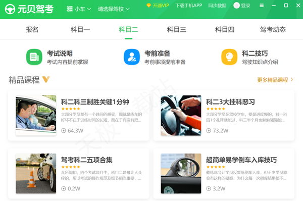 3.科目二,科目三为路考,我们可以查看考试说明,考前准备以及对应的小技巧,元贝驾考还提供课程供我们学习。