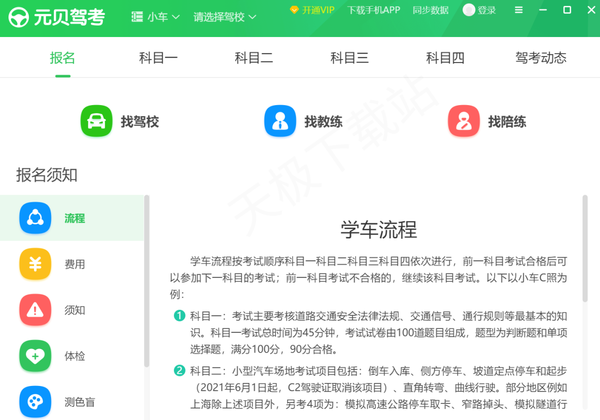 1.报名,我们在这里可以找驾校,找教练,找陪练,下方还有报名流程,费用,注意事项等,让我们明白驾照到底怎么考。
