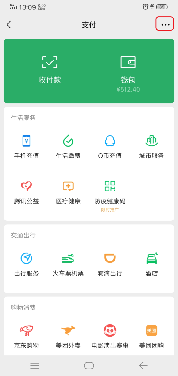 第三步,进入到微信的支付界面后,找到界面右上角的【…】三个点的图标,并点击打开。