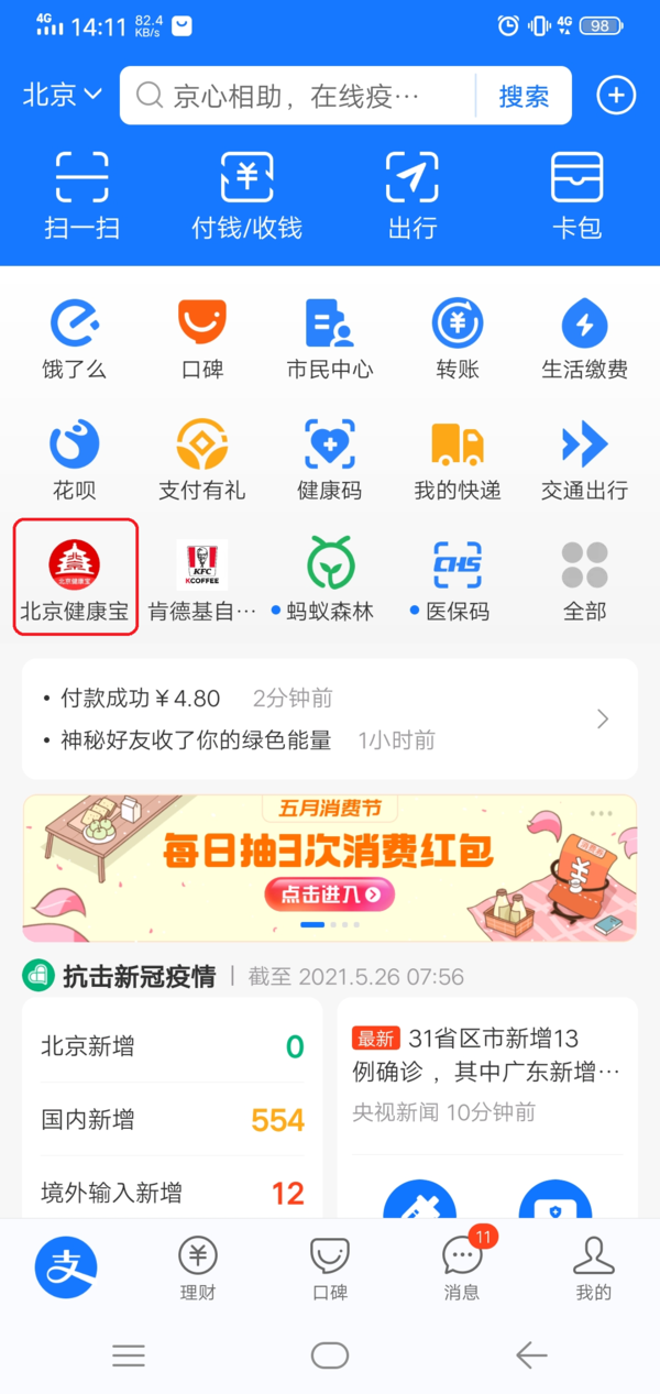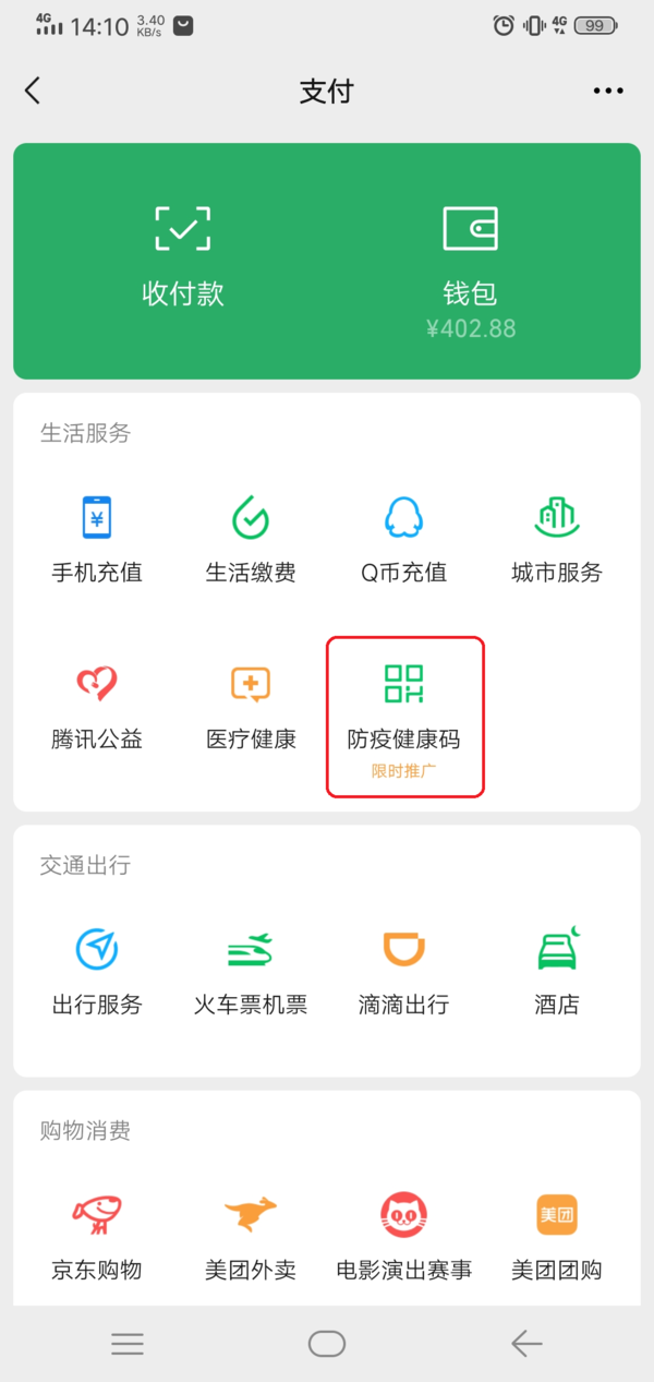 第三步,进入到个人的支付界面后,我们在界面中找到【健康码】功能,并点击打开。