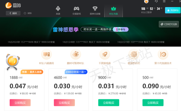 1.价格便宜,性价比高。雷神加速器会员价格非常便宜,如图,而且可以随时关闭加速时间,不会浪费加速时长,性价比非常高。