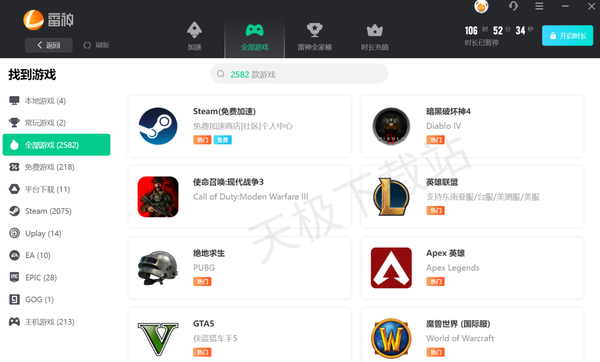 3.界面简洁,游戏种类多。雷神加速器界面相对更加简洁,而且拥有的可加速游戏非常多。