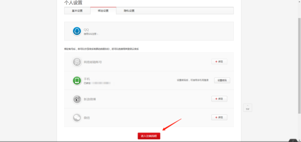 第三步,进入个人设置页面选择绑定设置,点击最下方进入注销流程;