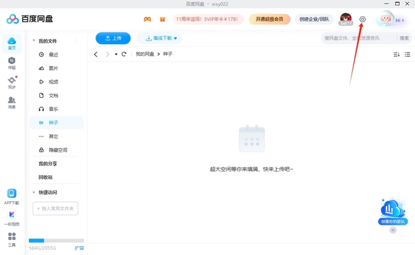 1、我们来到百度网盘主界面后,点击界面右上方头像右侧的【齿轮】图标,进入设置界面;
