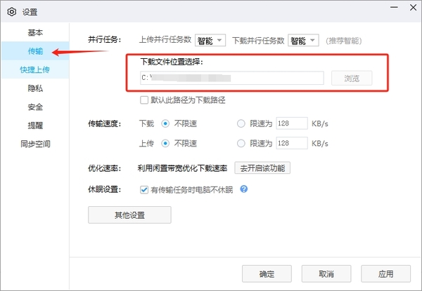 同样地,我们通过设置→传输找到下载路径之后,需要先点击勾选下方“默认此路径为下载路径”,之后才可以解锁下载路径权限。