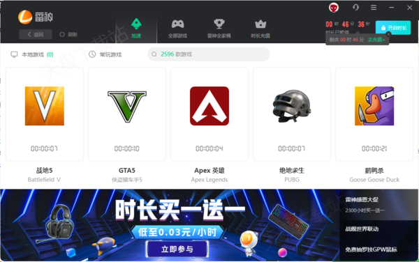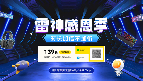 根据查找到的资料来看,雷神加速器感恩季活动还是很划算很值得参与的,因为此次活动有买一赠一的优惠,花139元即可获得2300小时加送2300小时总共4600小时的游戏加速时长,并且参加此次的充值还可以进行抽奖,抽奖的中奖率是100%,经常使用雷神加速网游的小伙伴们,一定不能错过本次活动哦。