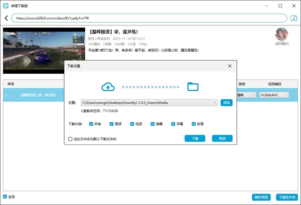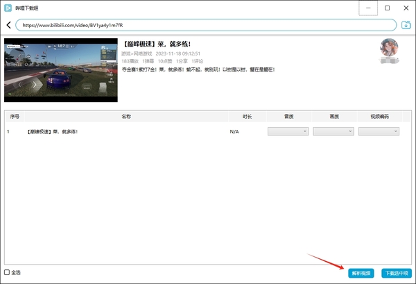 5、解析成功后,我们会发现待下载视频中,有音质、画质、编码等内容选择;调整好之后,点击右下角【下载选中项】;