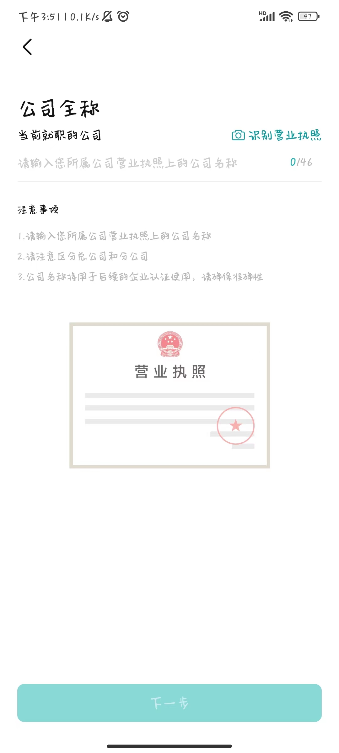 4、输入公司的名称及营业执照,就可以上传招聘信息了