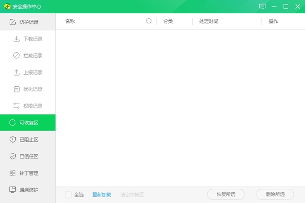 3、之后,如果我们有被拦截的内容,会在恢复区显示,此时点击【恢复】,并且确认即可;(由于小编的电脑中暂时没有被无故拦截的文件,故恢复区为空)