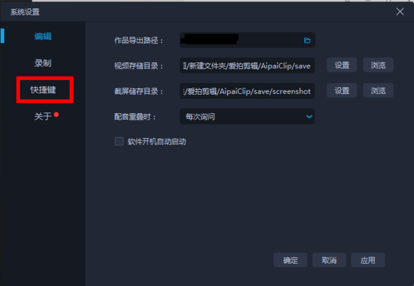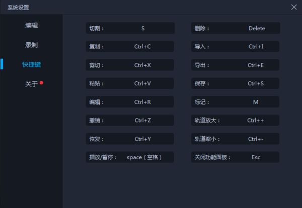 最后,在左侧选择快捷键选项,就能看到爱拍剪辑里各个功能的快捷键是什么了。