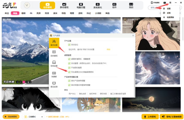 元气桌面运行时双击空白处不能隐藏桌面软件图标一般是由于没有开启此功能造成的,因为我们要实现双击隐藏桌面软件,就需要在元气桌面的【设置】窗口中,找到【基本设置】选项,然后将【双击桌面空白处隐藏桌面图标】的功能勾选上,就可以轻松实现一键隐藏桌面软件了。