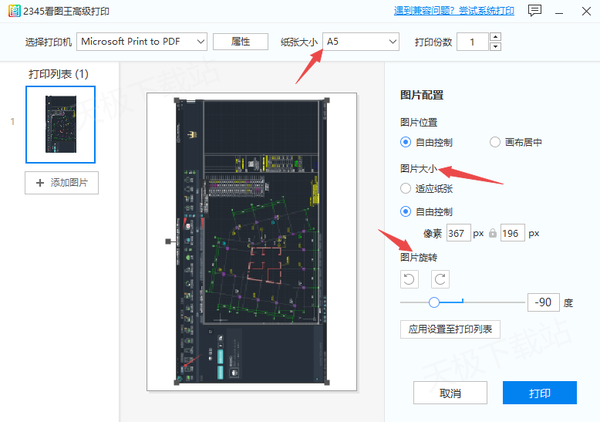 在2345看图王软件的高级打印界面中,找到【纸张大小】、【图片大小】和【图片旋转】功能,然后根据自己的实际需求来进行相应的参数调整,就可以将要打印的图片变大,最后设置好以后直接进行打印即可。