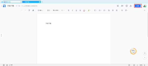 第三步,进入到文档界面后,我们找到界面右上角的【分享】按钮,并点击它。