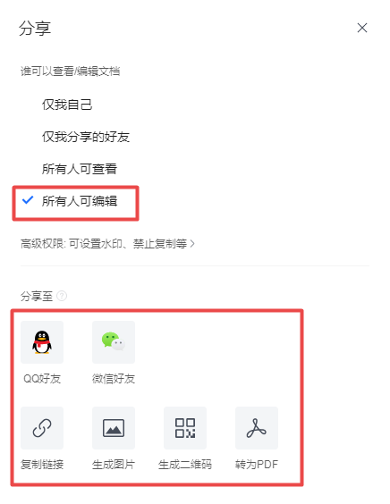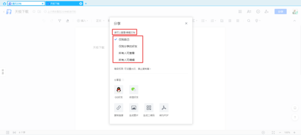 第四步,接着界面上就会弹出分享的设置窗口了,在此界面中,我们先根据自己的实际需求,来对【谁可以查看/编辑文档】的权限来进行设置,可以设置为【仅我自己】查看/编辑,也可以设置为【仅我分享的好友】可以查看/编辑,还能够设置为【所有人可查看】或【所有人可编辑】的权限。