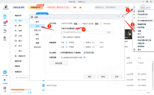 二、点击软件右上角的三个竖点图标,然后选择【设置】选项,接着进入到【传输】设置界面,最后将【下载文件位置选择】的下载路径,设置为有效的下载路径,一般也是可以解决问题的。